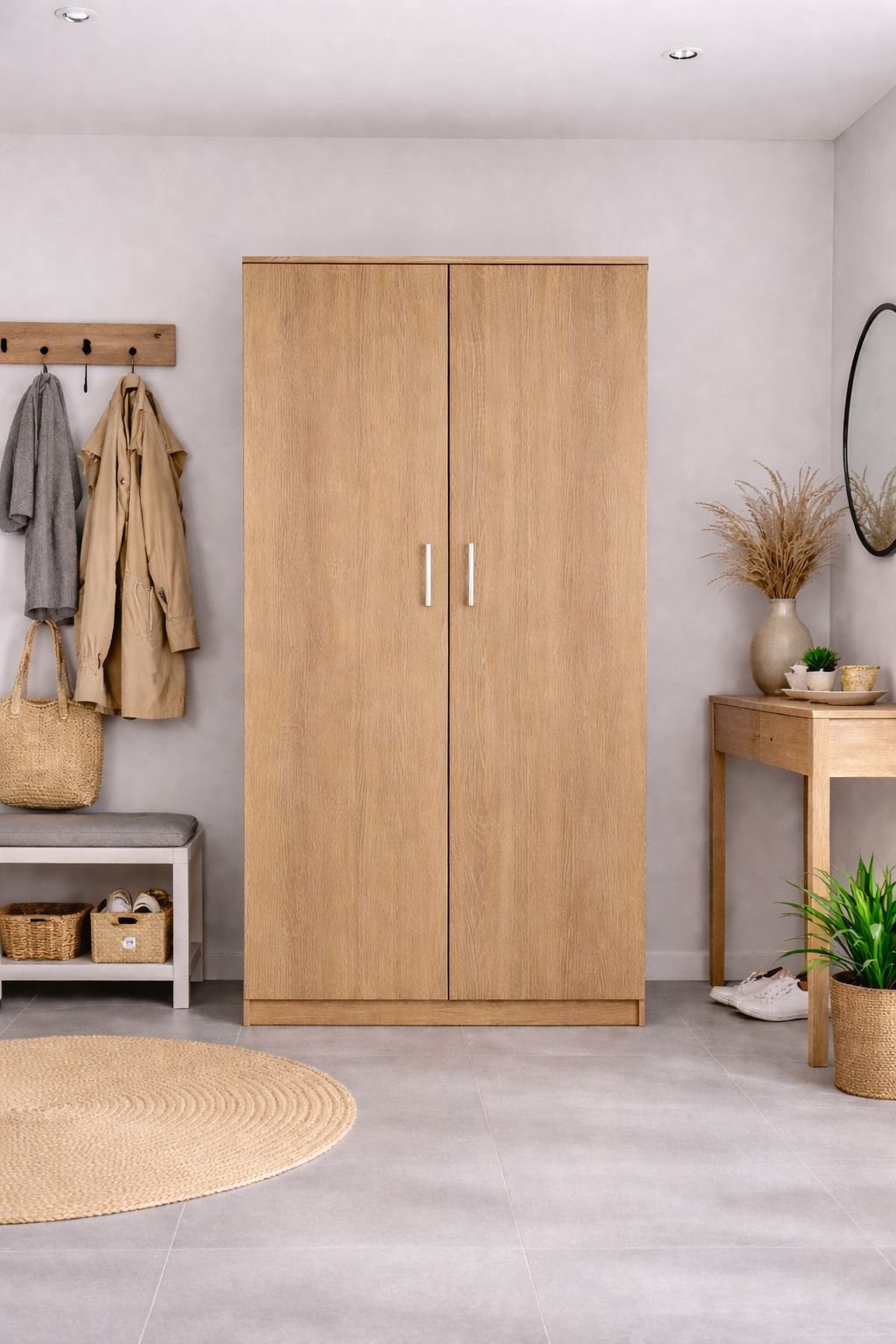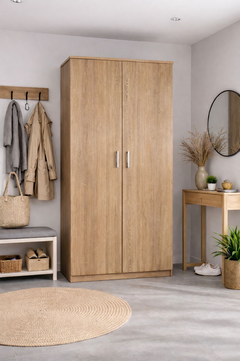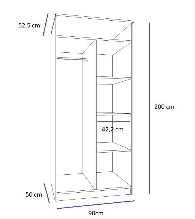 Ši 2 durų spinta (90/200/52,5 cm) – puikus pasirinkimas jūsų persirengimo kambariui, svetainei ar miegamajam. Pagaminta iš aukštos kokybės laminuotos plokštės, praktiška lentynų dalis ir drabužių skersinis suteikia daug vietos daiktams susidėti. Tvirta konstrukcija garantuoja ilgaamžiškumą ir užtikrina, kad ši spinta tarnaus daugelį metų. Ši 90 cm pločio spinta yra vienas populiariausių pasirinkimų mažesniems miegamiesiems, koridoriams ir vaikų kambariams. Ji derina kompaktiškus matmenis ir aukštą funkcionalumą.