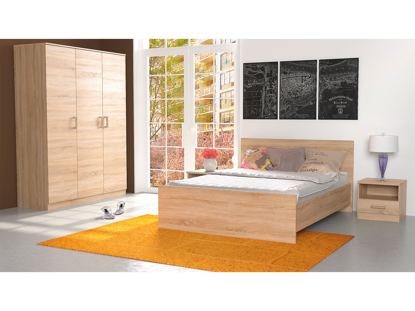 Šį miegamojo baldų komplektą sudaro lova, drabužių spinta, komoda ir naktiniai staleliai. Juos taip pat galima įsigyti atskirai, todėl galite susikurti savo miegamojo baldų komplektą pagal savo individualius pageidavimus. Jie yra patogūs ir erdvūs dėl gerai apgalvotų daiktų laikymo funkcijų. Dėl aukščiausios kokybės gamybos jais galėsite džiaugtis ilgus metus. Komplektą sudaro: