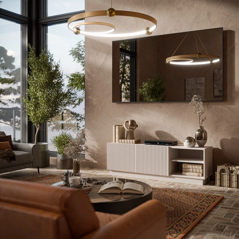 Šis 150 cm ilgio televizoriaus staliukas – elegantiškas ir funkcionalus sprendimas moderniam interjerui. MDF fasadai, dekoruoti vertikaliais kašmyro spalvos grioveliais, suteikia baldui rafinuoto charakterio. Dizainą sudaro dvi rakinamos spintelės ir atvira niša, puikiai tinkanti elektronikai ar dekoracijoms. 8 cm aukščio cokolis užtikrina stabilumą, o tradicinių rankenėlių nebuvimas – dėl subtiliai virš stalviršio išsikišusių fasadų – pabrėžia minimalistinį stilių. Tai puikus pasirinkimas svetainei, derinantis estetiką su funkcionalumu.