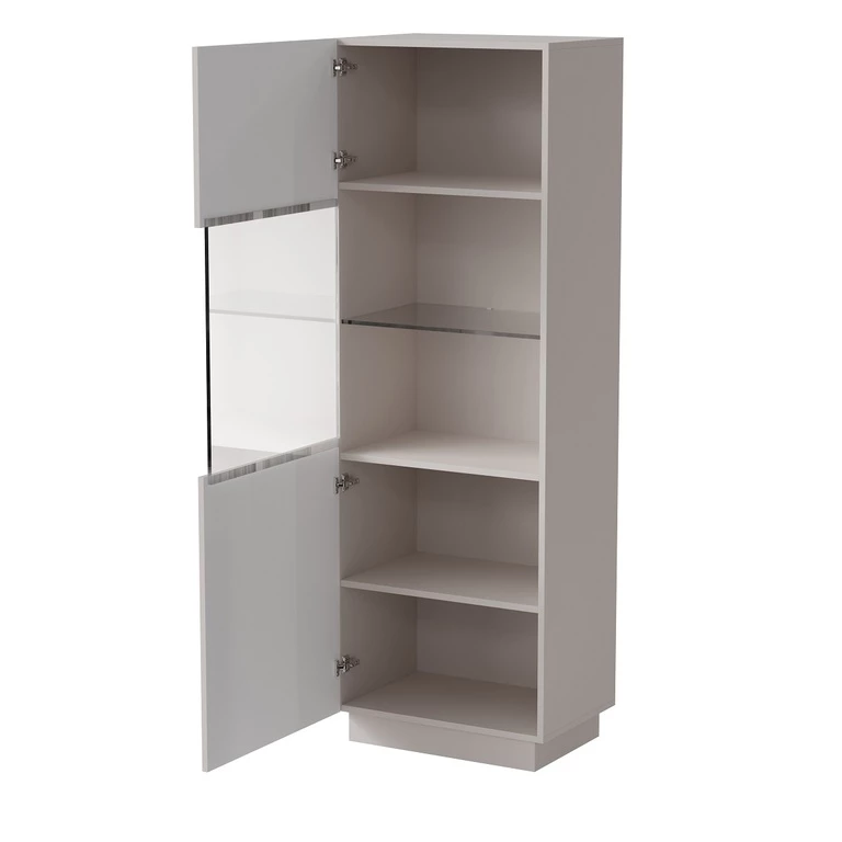 Ši siaura kašmyro vitrina – elegantiškas baldas su moderniu charakteriu. Iš frezuoto MDF pagaminti fasadai suteikia subtilios tekstūros ir stilingą išvaizdą. Tradicinių rankenėlių nebuvimas – fasadai šiek tiek išsikišę virš stalviršio – pabrėžia minimalistinį dizainą. 8 cm aukščio cokolis užtikrina stabilumą ir lengvą konstrukciją. Puikiai tinka dekoracijoms, stikliniams indams ar knygoms eksponuoti, ji puikiai atrodys svetainėje ar valgomajame.