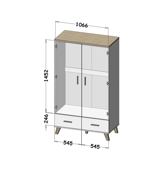 LOTTA 110 – Matinės baltos spalvos spinta ant kojų, 2 durelėmis ir 2 stalčiais, skandinaviško stiliaus