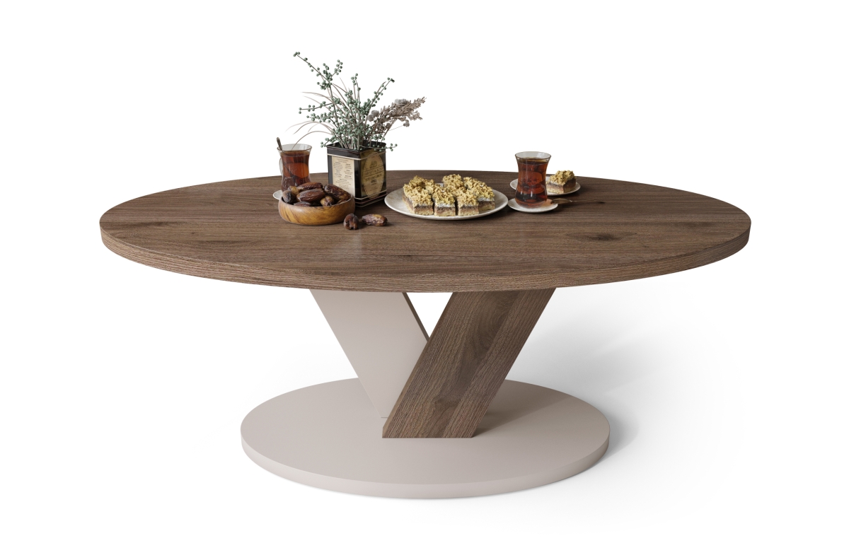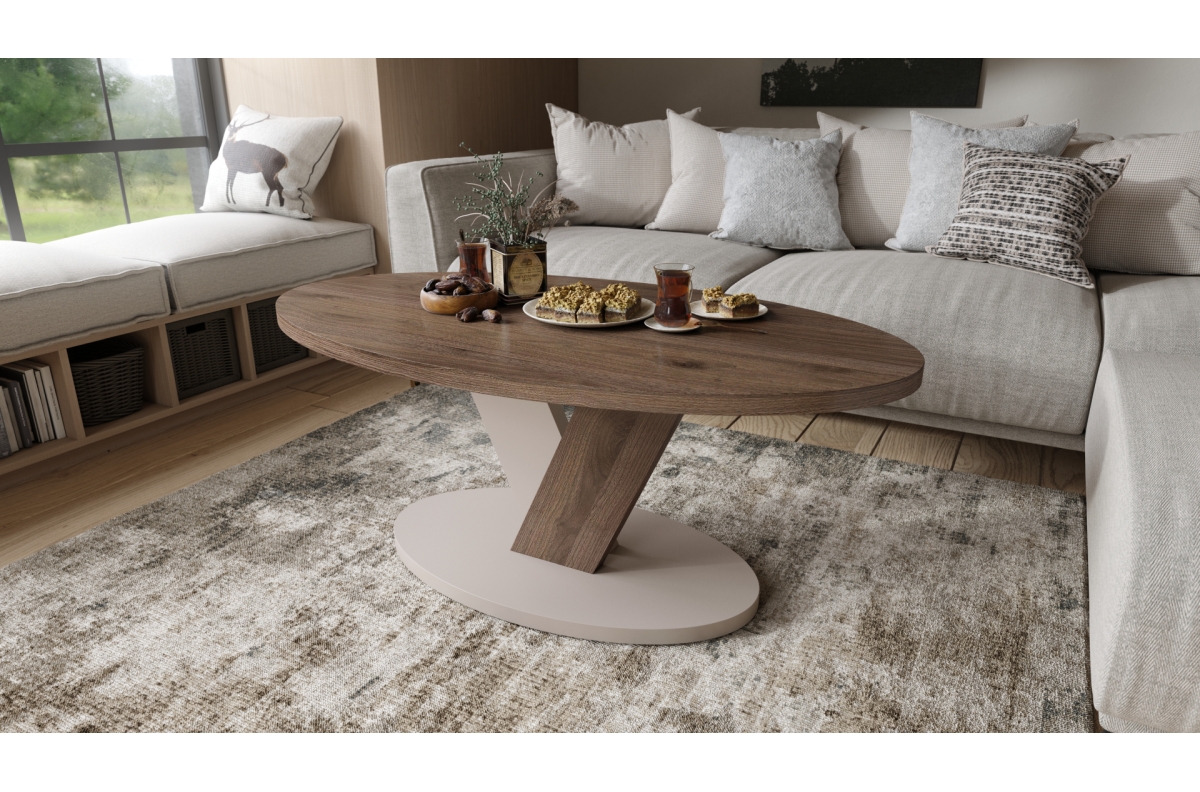 LOVA Elegantiškas riešuto/smėlinės smėlio spalvos – OVALUS kavos staliukas 110×60 cm MODERNUS kavos staliukas