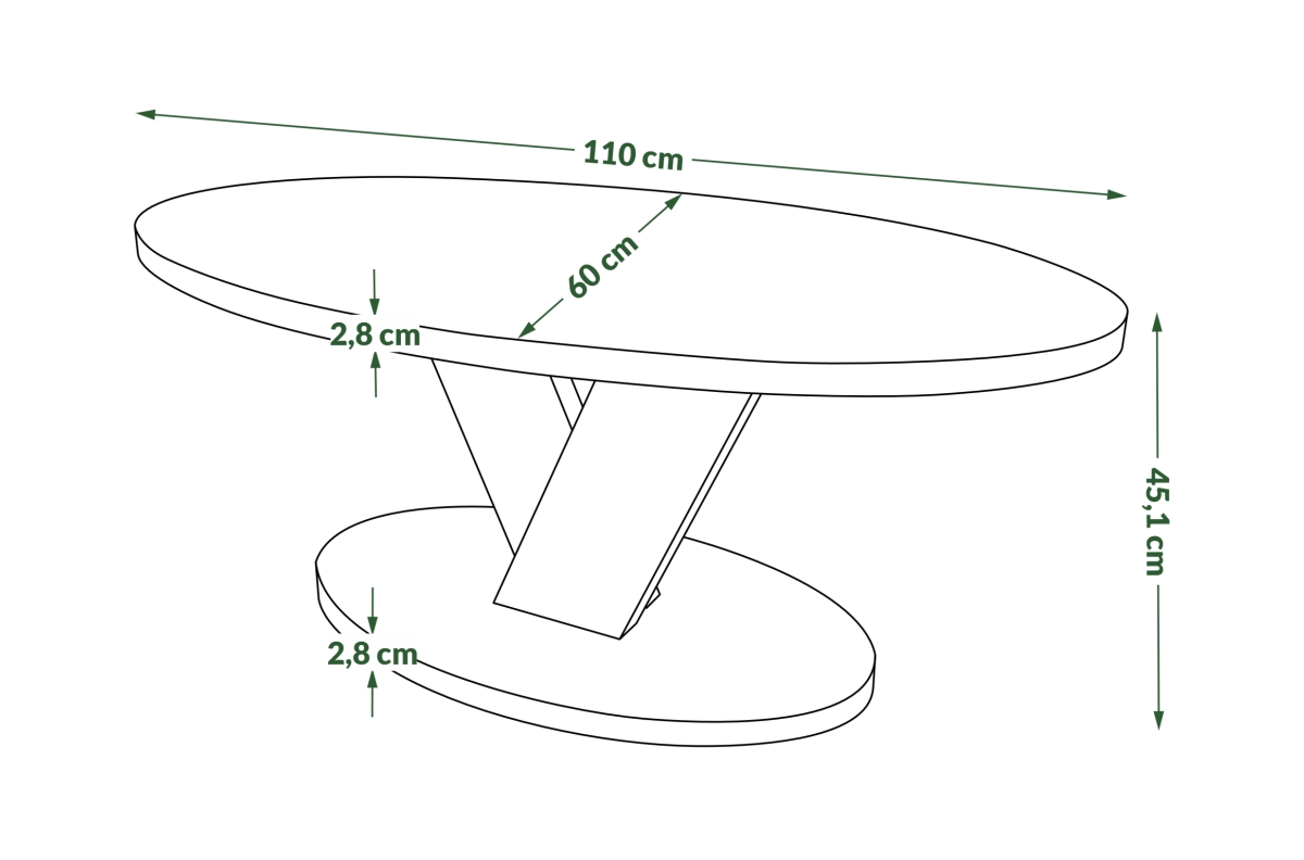 PLOTIS 110 cm, GYLIS 60 cm, AUKŠTIS 45 cm VIRŠAUS FORMA Ovali, MEDŽIAGOS Medžio drožlių plokštė, PAVIRŠIUS Matinis, STILIUS Modernus, SVORIS SU PAKUOTE 18,5 kg