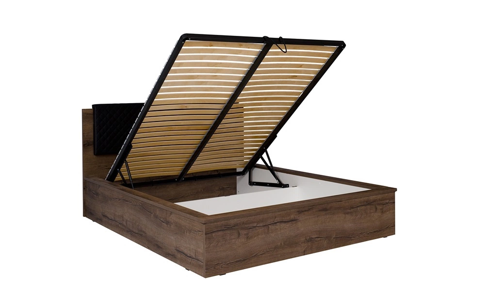 Denver lova 160×200 cm su patalynės dėže, Monastery ąžuolas/juoda, tobula lova miegamajam, dalinai apmuštas galvūgalis