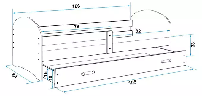 Lovos rėmas – pagamintas iš pušies medienos, dažytas vandens pagrindo laku. Surinkimo priedai – greitas ir paprastas surinkimas. MDF plokštė – dažyta vandens pagrindo laku. Laminuotas lipdukas. Čiužinys – 7 cm storio, su nuimamu užvalkalu, oro kondicionavimo pluoštu ir poliuretano putomis. Užvalkalas – dygsniuotas hipoalerginis audinys, pagamintas iš poliesterio, su užtrauktuku. HDF plokštė. HDF plokštė. Stalčiaus rankena – pagaminta iš PVC. Stalčius – pagamintas iš medžio drožlių plokštės. Stalčiaus ratukai. Apvalinimo spindulys – R2. Maksimali apkrova – 100 kg. Sertifikuota lova – kokybė ir saugumas pagal TUV standartus.