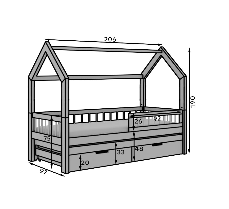 „Artes II“ namelio formos lova – puikus sprendimas ieškantiems originalaus dizaino ir praktiškų sprendimų vaiko ar paauglio kambariui. Šis modelis yra **dvigulė lova** su unikalia namelio forma, kuri lengvai gali tapti bet kokio interjero traukos centru. Lova aprūpinta **papildomais stalčiais**, kurie padeda sutvarkyti erdvę, leidžia laikyti patalynę, žaislus ir kitus būtiniausius daiktus. Tai suteikia jūsų vaikui daugiau erdvės žaidimams ir mokymuisi. Vienas didžiausių „Artes II“ lovos privalumų yra jos **modulinė konstrukcija**. Namo formos rėmą galima lengvai išardyti, todėl galite jį paversti klasikiškesniu lovos modeliu, pritaikytu prie kintančių jūsų vaiko poreikių.