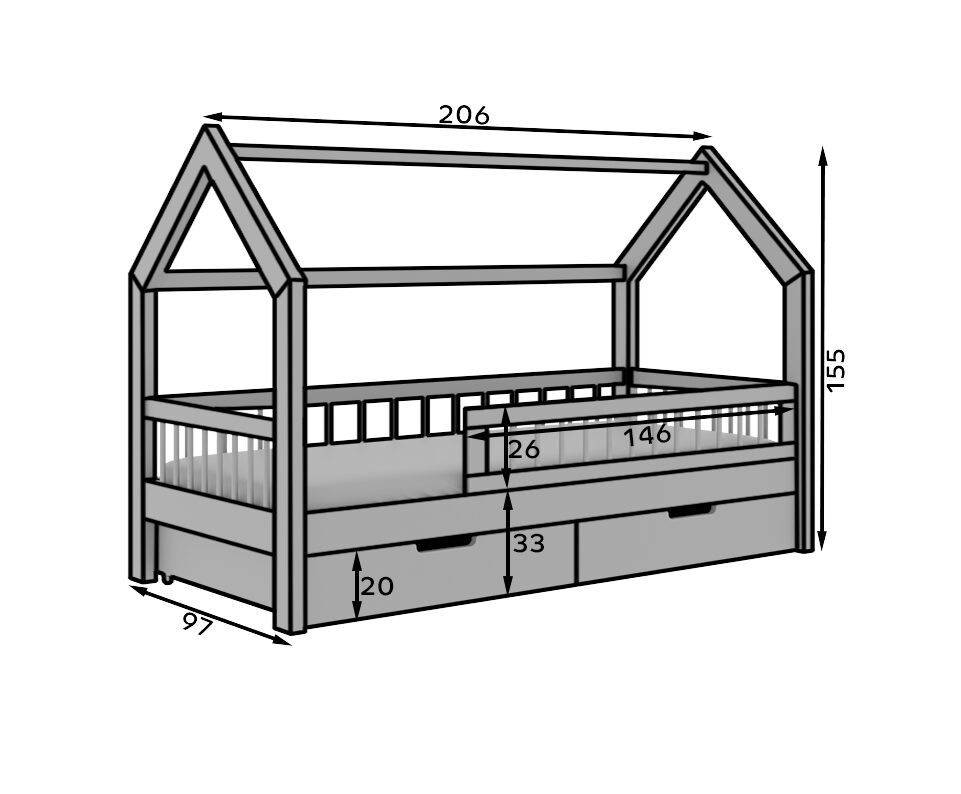 „Galicja“ namelio formos lova – tai unikalus baldas, kuriame dera funkcionalumas ir jaukios, skandinaviškos estetikos įkvėptas dizainas. Pagaminta iš medžio masyvo, lova užtikrina stabilumą ir ilgaamžiškumą, o interjerui suteikia šilto, natūralaus žavesio. Namo formos struktūra skatina vaiko vaizduotę, sukuria jaukią vietą žaidimams ir poilsiui. Tai idealus vaiko kambario centrinis elementas, užtikrinantis patogų miegą ir įkvepiantis kūrybiniam žaidimui. Paprasta forma ir natūrali apdaila paverčia „Galicja“ lovą harmoningu bet kokio interjero papildymu, nepriklausomai nuo stiliaus. Čiužinys įskaičiuotas.
