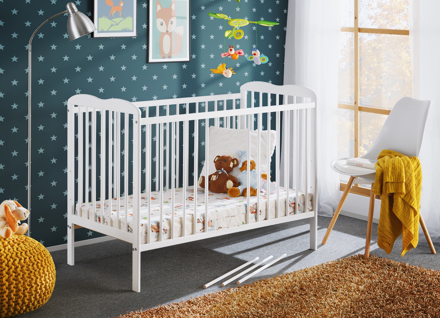 Pagaminta iš pušies medienos (iš FSC sertifikuotų miškų). Reguliuojamas grotelių aukštis. 3 nuimami laipteliai. Modeliuoti galvūgalio rėmai. Atitinka EN 716-1: 2008 + A1: 2013 ir EN 716-2: 2008 + A1: 2013 standartus. Dažyta pagal EN 71-3: 2013 standartą.