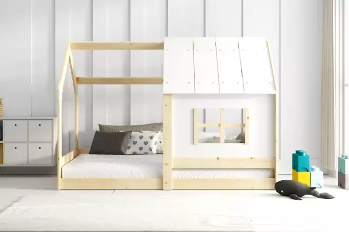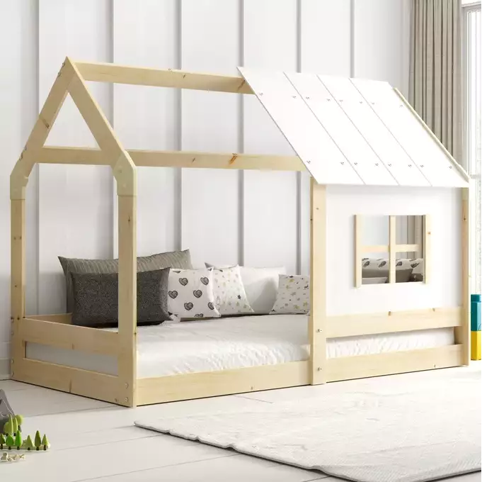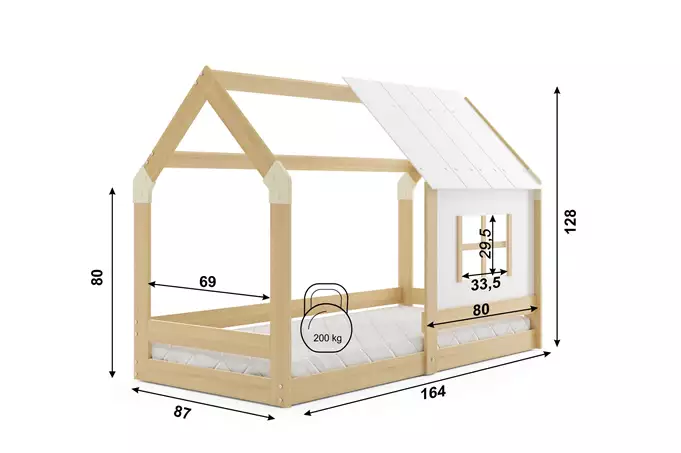 Komplektą sudaro: Lovos rėmas, pagamintas iš pušies medienos, nelakuotas. Čiužinys 160×80 (1 vnt.) (dygsniuotas hipoalerginis audinys iš poliesterio + oro kondicionavimo pluoštas + poliuretano putos + užtrauktukas). Saugus lango formos turėklas. Baldų furnitūra su instrukcijomis. Rėmas – esame vienintelė įmonė, siūlanti rėmą iš spyruoklinių lentelių, pagamintų iš beržo medienos, tvirtinamų PVC laikikliu ant metalinės juostelės, naudojant „click-clack“ sistemą (greitas surinkimas). Užapvalintas spindulys R2 – užapvalinti lovos kraštai efektyviai sumažina traumų riziką, apsaugodami vaiką nuo įbrėžimų ir sumušimų žaidžiant ar atsistojus. Maksimali apkrova 200 kg.
