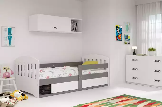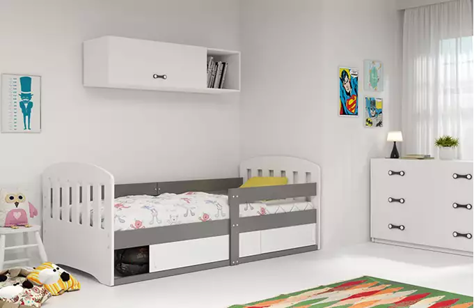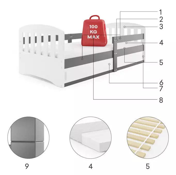 Lovos rėmas – pagamintas iš pušies medienos, dažytas vandens pagrindo laku. Surinkimo priedai – greitas ir paprastas surinkimas. MDF plokštė – dažyta vandens pagrindo laku. Čiužinys – 160x80x7 dydžio, su nuimamu užvalkalu, oro kondicionavimo pluoštu ir poliuretano putomis. Užvalkalas – dygsniuotas hipoalerginis audinys, pagamintas iš poliesterio, su užtrauktuku. Medinis rėmas – pušies lentjuostės. Balta HDF plokštė. Konteineris be pagrindo plokštės. Stumdomų fasadų rankena – pagaminta iš PVC. Keliamoji galia – 100 kg. Apvalinimo spindulys – R2.
