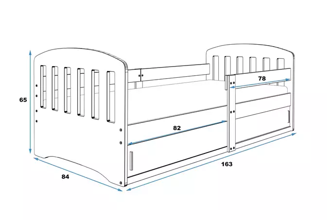Lovos rėmas – pagamintas iš pušies medienos, dažytas vandens pagrindo laku. Surinkimo priedai – greitas ir paprastas surinkimas. MDF plokštė – dažyta vandens pagrindo laku. Čiužinys: nėra. Medinis rėmas – pušies lentjuostės. Balta HDF plokštė. Konteineris be dugno plokštės. Stumdomų fasadų rankena – pagaminta iš PVC. Keliamoji galia – 100 kg. Apvalinimo spindulys – R2.