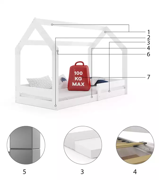 Lovos rėmas – pagamintas iš pušies medienos, dažytas vandens pagrindo laku. Surinkimo priedai – greitas ir paprastas surinkimas. Čiužinys: nėra. Rėmas – esame vienintelė įmonė, siūlanti rėmą iš spyruoklinių lentelių, pagamintą iš beržo medienos, pritvirtintą PVC rankena ant metalinės juostelės, su spragtelėjimo sistema (greitas surinkimas). Apvalinimas – spindulys R2. PVC korpusas – naudojamas jungtims paslėpti. Keliamoji galia – 100 kg.