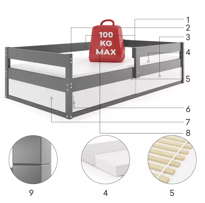 Lovos rėmas iš pušies medienos, dažytas vandens pagrindo laku. Plieniniai varžtai – baldų furnitūra. Balta HDF plokštė. Konteineris be dugno plokštės. Čiužinys: matmenys 160x80x7 + užvalkalas (dygsniuotas hipoalerginis audinys iš poliesterio + oro kondicionavimo pluošto + poliuretano putų + užtrauktukas). Medinis rėmas (pušies lentjuostės). PVC rankena. HDF plokštė. Maksimali rėmo apkrova – 100 kg. Apvalinimo spindulys R2.