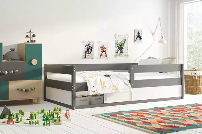 HUGO viengulė vaikiška lova 80×160 su čiužiniu ir daiktadėže, grafito spalvos