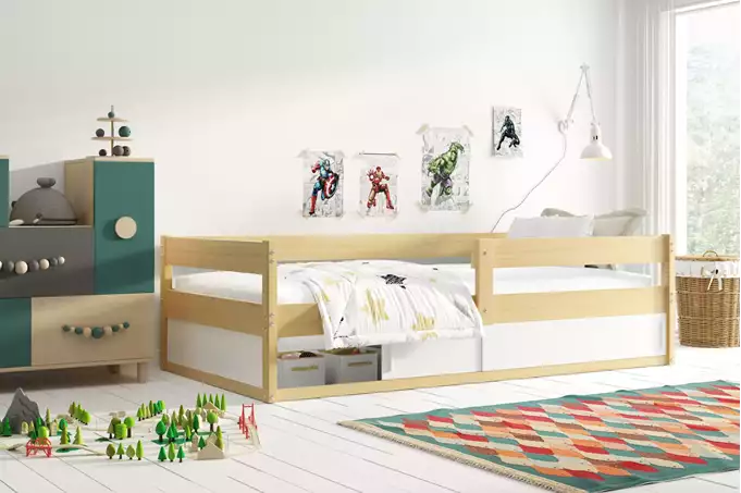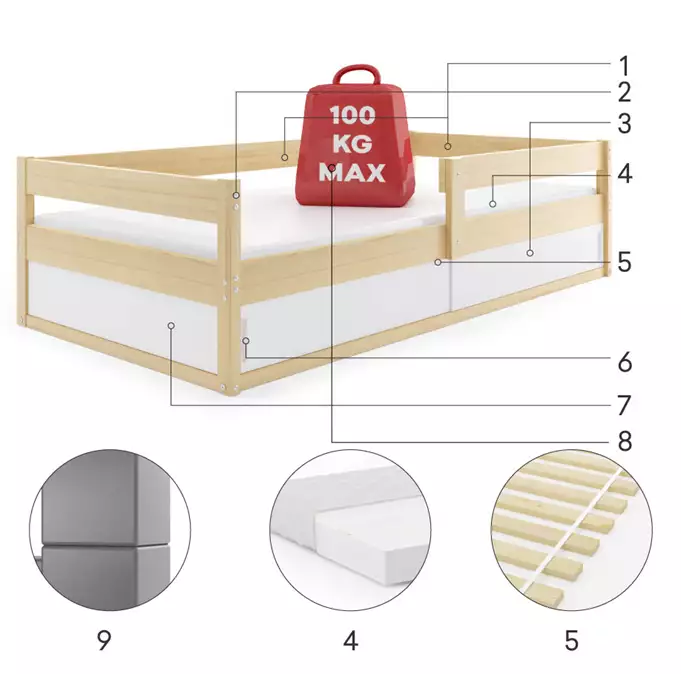 Lovos rėmas pagamintas iš nedažytos pušies medienos. Plieniniai varžtai – baldų furnitūra. Balta HDF plokštė. Konteineris be dugno. Čiužinys: nėra. Medinis rėmas (pušies lentjuostės). PVC rankena. HDF plokštė. Maksimali rėmo apkrova – 100 kg. Apvalinimo spindulys R2.