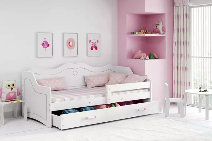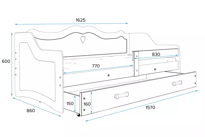 Lovos rėmas – pagamintas iš pušies medienos, dažytas vandens pagrindo laku. Universalus bėgelis – dvipusis montavimas. Surinkimo priedai – greitas ir paprastas surinkimas. MDF plokštė – dažyta vandens pagrindo laku. Čiužinys – matmenys 160x80x7, su nuimamu užvalkalu, oro kondicionavimo pluoštu ir poliuretano putomis. Užvalkalas – dygsniuotas hipoalerginis audinys, pagamintas iš poliesterio, su užtrauktuku. Rėmas – HDF plokštė. Baldų plokštė. Stalčius – laminuota medžio drožlių plokštė. PVC rankena. Stalčiaus ratukai – be bėgelių. Stalčiaus gylis 48,5 cm. Apvalinimo spindulys – R2.