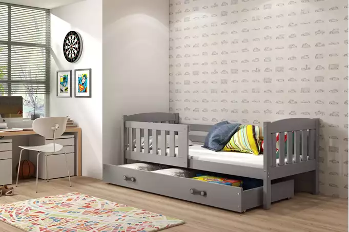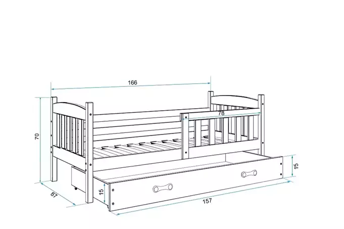 Lovos rėmas – pagamintas iš pušies medienos, dažytas vandens pagrindo laku. Surinkimo priedai – greitas ir paprastas surinkimas. Čiužinys – 7 cm storio, su nuimamu užvalkalu, oro kondicionavimo pluoštu ir poliuretano putomis. Užvalkalas – dygsniuotas hipoalerginis poliesterio audinys, su užtrauktuku. Rėmas – esame vienintelė įmonė, siūlanti rėmą iš spyruoklinių lentelių, pagaminto iš beržo medienos, tvirtinamo PVC rankena ant metalinės juostelės, naudojant spragtelėjimo sistemą (greitas surinkimas). HDF plokštė. Stalčius – pagamintas iš medžio drožlių plokštės. Stalčiaus rankena – pagaminta iš PVC. Stalčiaus ratukai. Apvalinimo spindulys – R2. Keliamoji galia – 100 kg. Sertifikuota lova – kokybė ir saugumas pagal TUV standartus.