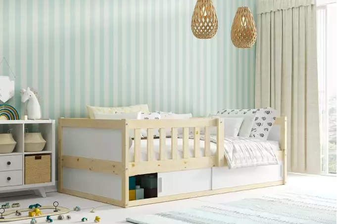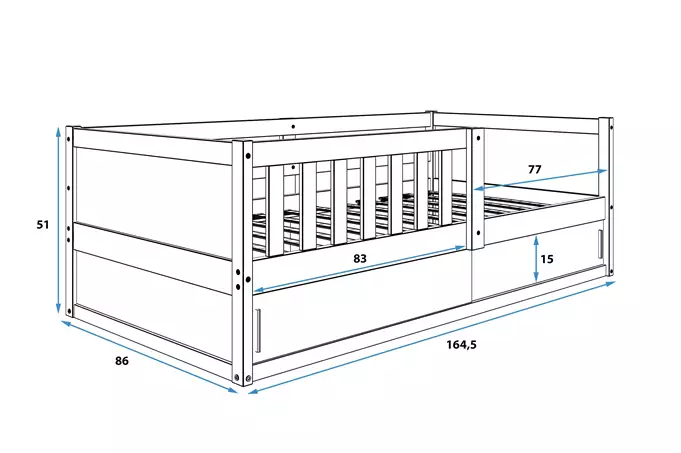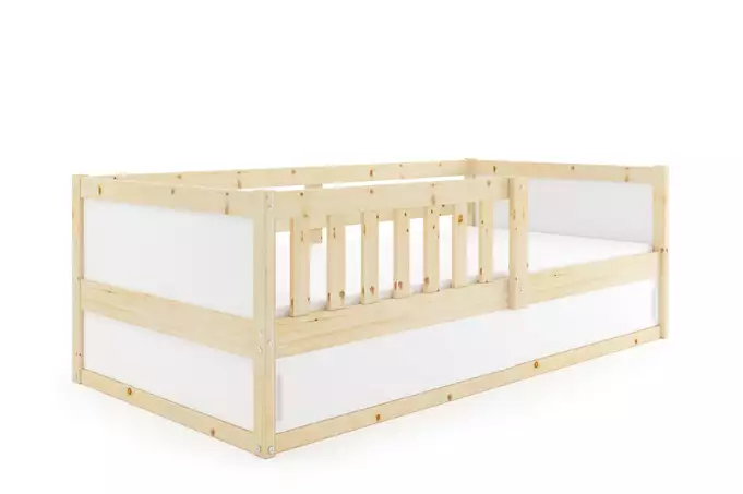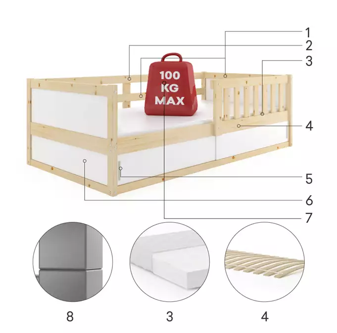 Lovos rėmas iš pušinės medienos. Plieniniai varžtai – baldų furnitūra. Balta HDF plokštė. Konteineris be dugno plokštės. Čiužinys: nėra. Medinis rėmas (pušinės lentjuostės). PVC rankena. HDF plokštė. Maksimali apkrova – 100 kg. Suapvalinti kraštai – R2 spindulys.