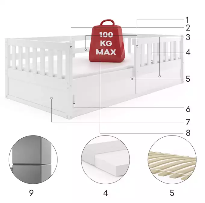 Pušinės medienos lovos rėmas, dažytas vandens pagrindo pušies laku. Plieniniai varžtai – baldų furnitūra. Balta HDF plokštė. Konteineris be dugno. Čiužinys: nėra. Medinis rėmas (pušinės grotelės). PVC rankena. HDF plokštė. Maksimali apkrova: 100 kg. Suapvalinti kraštai – R2 spindulys.