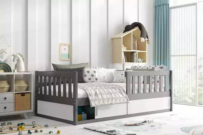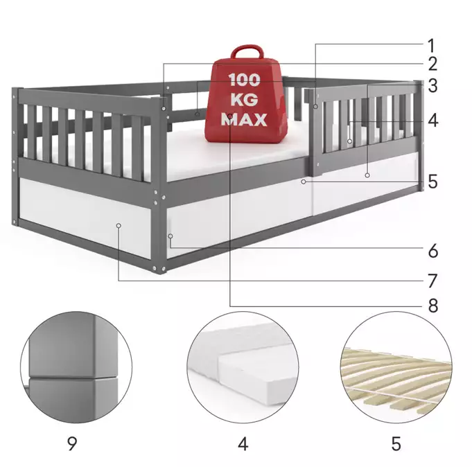 Pušinės medienos lovos rėmas, dažytas vandens pagrindo pušies laku. Plieniniai varžtai – baldų furnitūra. Balta HDF plokštė. Konteineris be dugno. Čiužinys: nėra. Medinis rėmas (pušinės grotelės). PVC rankena. HDF plokštė. Maksimali apkrova: 100 kg. Suapvalinti kraštai – R2 spindulys.