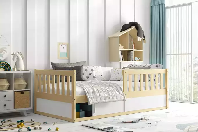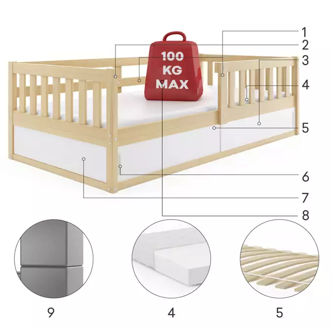 Nedažytas pušinis lovos rėmas. Plieniniai varžtai – baldų furnitūra. Balta HDF plokštė. Konteineris be dugno plokštės. Čiužinys: nėra. Medinis rėmas (pušinės lentjuostės). PVC rankena. HDF plokštė. Maksimali apkrova – 100 kg. Suapvalinti kraštai – R2 spindulys.