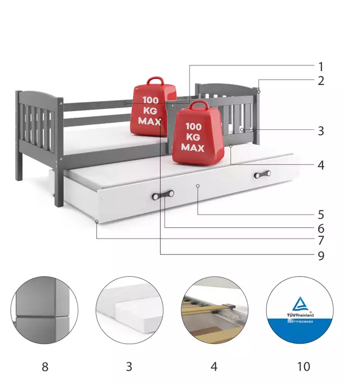 Lovos rėmas – pagamintas iš pušies medienos, dažytas vandens pagrindo laku. Surinkimo priedai – greitas ir paprastas surinkimas. Čiužiniai – 7 cm storio (2 vnt.), su nuimamu užvalkalu, oro kondicionavimo pluoštu ir poliuretano putomis. Užvalkalas – dygsniuotas hipoalerginis poliesterio audinys, su užtrauktuku. Rėmas – esame vienintelė įmonė, siūlanti rėmą, pagamintą iš spyruoklinių beržo medienos lentelių, tvirtinamą PVC rankena ant metalinės juostelės, naudojant spragtelėjimo sistemą (greitas surinkimas). Stalčius – pagamintas iš medžio drožlių plokštės, su papildoma miegojimo funkcija. Stalčiaus rankena – pagaminta iš PVC. Stalčiaus ratukai. Apvalinimas – R2 spindulys. Keliamoji galia – 100 kg kiekvienam lygiui. Sertifikuota lova – kokybė ir saugumas pagal TUV standartus.