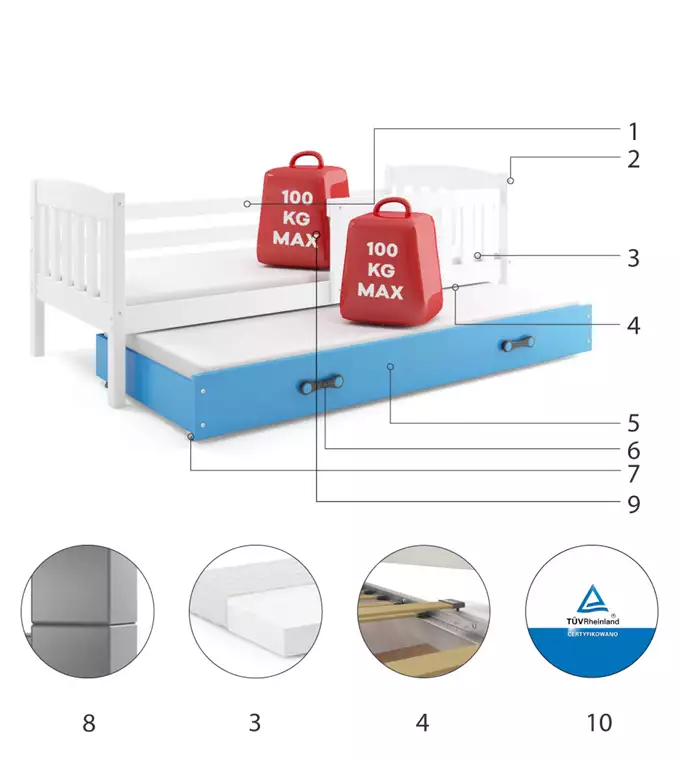 Lovos rėmas – pagamintas iš pušies medienos, dažytas vandens pagrindo laku. Surinkimo priedai – greitas ir paprastas surinkimas. Čiužinys: nėra. Rėmas – esame vienintelė įmonė, siūlanti rėmą iš spyruoklinių lentelių, pagamintą iš beržo medienos, pritvirtintą PVC rankena ant metalinės juostelės, su spragtelėjimo sistema (greitas surinkimas). Stalčius – pagamintas iš medžio drožlių plokštės, turi papildomą miegojimo funkciją. Stalčiaus rankena – pagaminta iš PVC. Stalčiaus ratukai. Apvalinimas – spindulys R2. Keliamoji galia – 100 kg vienam lygiui. Sertifikuota lova – kokybė ir saugumas pagal TUV standartus.