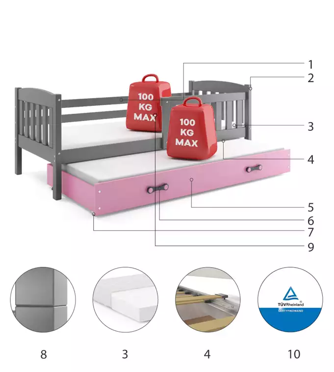 Būkite pirmas aprašęs “KUBUŚ vaikiška išskleidžiama lova 80×160 su stalčiumi, grafito/rožinė”
