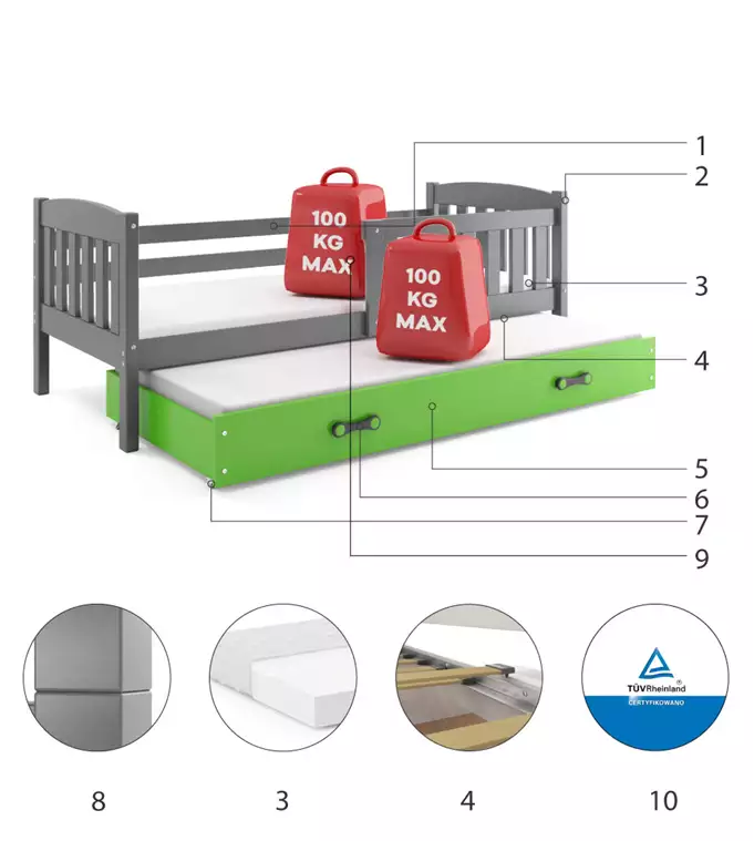 Lovos rėmas – pagamintas iš pušies medienos, dažytas vandens pagrindo laku. Surinkimo priedai – greitas ir paprastas surinkimas. Čiužinys: nėra. Rėmas – esame vienintelė įmonė, siūlanti rėmą iš spyruoklinių lentelių, pagamintą iš beržo medienos, pritvirtintą PVC rankena ant metalinės juostelės, su spragtelėjimo sistema (greitas surinkimas). Stalčius – pagamintas iš medžio drožlių plokštės, turi papildomą miegojimo funkciją. Stalčiaus rankena – pagaminta iš PVC. Stalčiaus ratukai. Apvalinimas – spindulys R2. Keliamoji galia – 100 kg vienam lygiui. Sertifikuota lova – kokybė ir saugumas pagal TUV standartus.