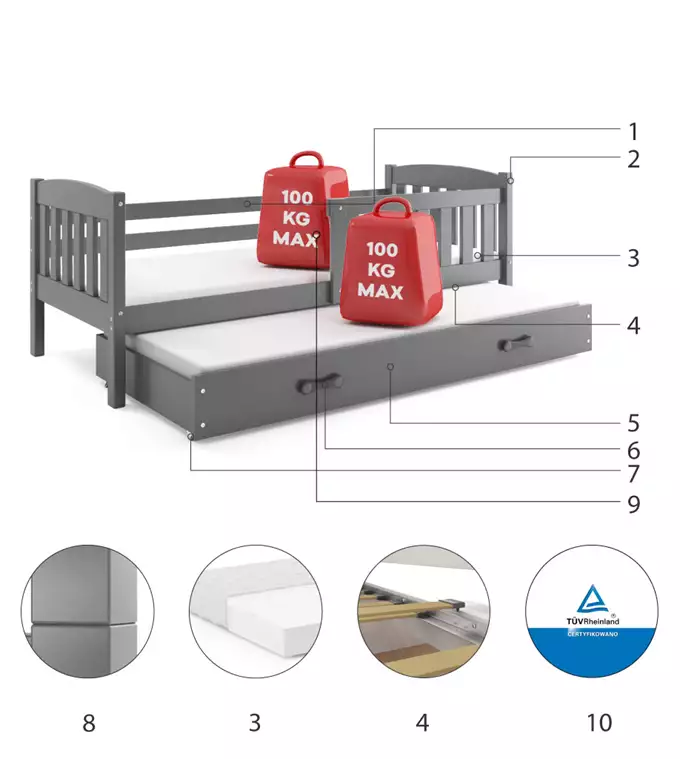 Lovos rėmas – pagamintas iš pušies medienos, dažytas vandens pagrindo laku. Surinkimo priedai – greitas ir paprastas surinkimas. Čiužinys: nėra. Rėmas – esame vienintelė įmonė, siūlanti rėmą iš spyruoklinių lentelių, pagamintą iš beržo medienos, pritvirtintą PVC rankena ant metalinės juostelės, su spragtelėjimo sistema (greitas surinkimas). Stalčius – pagamintas iš medžio drožlių plokštės, turi papildomą miegojimo funkciją. Stalčiaus rankena – pagaminta iš PVC. Stalčiaus ratukai. Apvalinimas – spindulys R2. Keliamoji galia – 100 kg vienam lygiui. Sertifikuota lova – kokybė ir saugumas pagal TUV standartus.