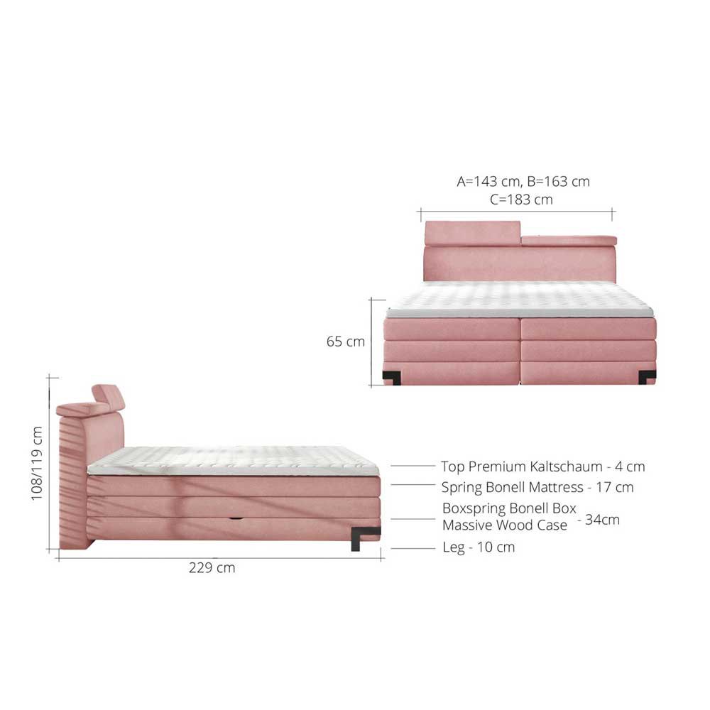 160 × 200 cm dydžio „Kano“ spyruoklinė lova suteikia neprilygstamą erdvės ir prabangos pojūtį. Čiužinyje yra „Bonnell“ ir kišeninių spyruoklių, todėl jis suteikia universalų atramos lygį ir aukščiausią komforto lygį. Reguliuojama galvos atrama leidžia pritaikyti jos padėtį pagal asmeninius pageidavimus, taip padidinant komfortą skaitant ar žiūrint televizorių. Tokios detalės kaip subtilus galvos atramos dygsniavimas ir praktiškas patalynės skyrius papildo rafinuotą dizainą ir sukuria tobulą vietą atsipalaiduoti.