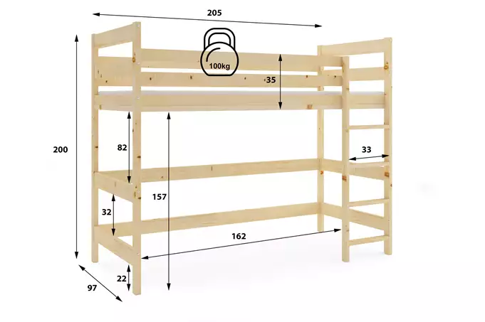Dviaukštė lova antresolėje. Komplektą sudaro: lovos rėmas, pagamintas iš nedažytos pušies medienos. 200×90 čiužinys (dygsniuotas hipoalerginis audinys iš poliesterio + oro kondicionavimo pluoštas + poliuretano putos + užtrauktukas). Saugus apsauginis turėklas. Baldų furnitūra su instrukcijomis. Rėmas – siūlome rėmą, pagamintą iš beržo medienos spyruoklinių lentjuosčių, tvirtinamą PVC laikikliu ant metalinės juostelės, naudojant „click-clack“ sistemą (greitas surinkimas). Užapvalintas spindulys R2 – užapvalinti lovos kraštai efektyviai sumažina traumų riziką, apsaugodami vaiką nuo įbrėžimų ir sumušimų žaidžiant ar atsistojant. Maksimali apkrova 100 kg.