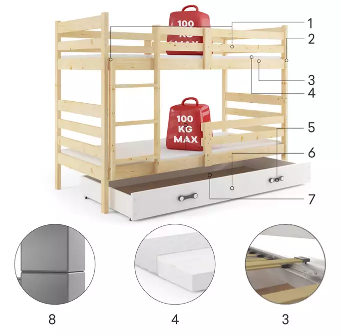 Lovos rėmas – pagamintas iš nedažytos pušies medienos. Galima padalinti į dvi viengules lovas. Surinkimo priedai – greitas ir paprastas surinkimas. Rėmas – siūlome rėmą, pagamintą iš spyruoklinių beržo medienos lentelių, pritvirtintą PVC laikikliu prie metalinės juostelės, naudojant spragtelėjimo sistemą (greitas surinkimas). Čiužinys: nėra. Stalčiaus rankena iš PVC. Laminuota plokštė. HDF plokštė. Apvalinimas – R2 spindulys. Didžiausia rėmo apkrova: 100 kg vienam lygiui.