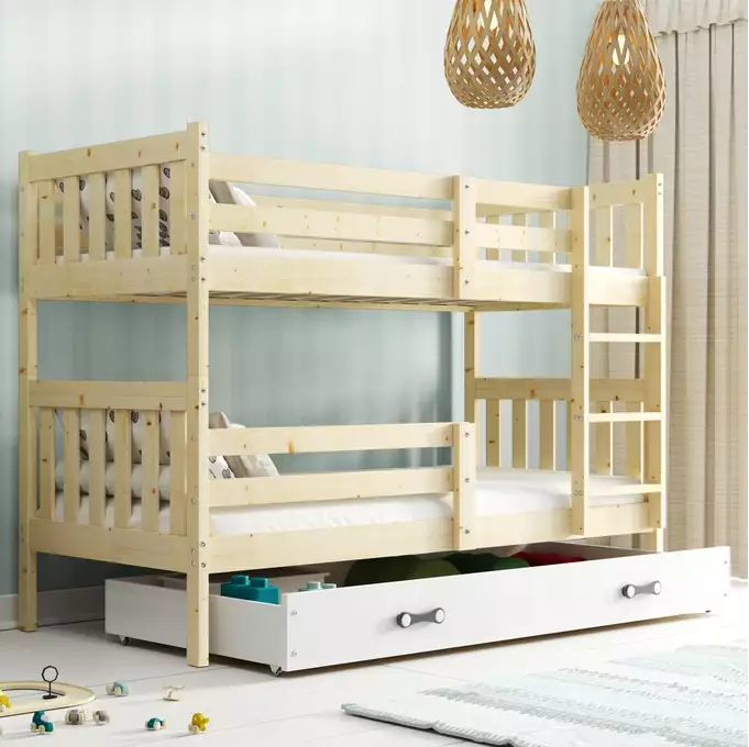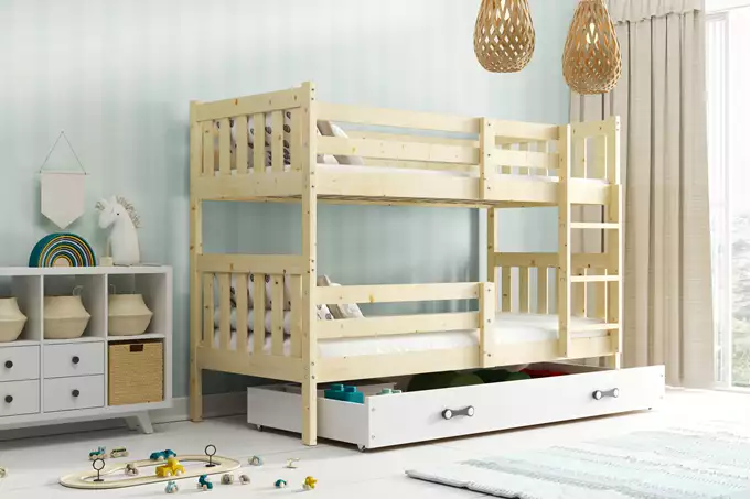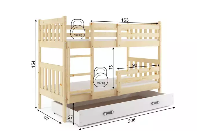 Lovos rėmas – pagamintas iš nedažytos pušies medienos. Galima padalinti į dvi viengules lovas. Surinkimo priedai – greitas ir paprastas surinkimas. Rėmas – siūlome rėmą, pagamintą iš spyruoklinių beržo medienos lentelių, pritvirtintų PVC laikikliu prie metalinės juostelės naudojant spragtelėjimo sistemą (greitas surinkimas). Čiužinys – matmenys 200x90x7 (2 dalys), su nuimamu užvalkalu, oro kondicionavimo pluoštu ir poliuretano putomis. Užvalkalas – dygsniuotas hipoalerginis poliesterio audinys, su užtrauktuku. PVC stalčiaus rankena. Laminuota plokštė. HDF plokštė. Išlenktas – spindulys R2. Maksimali rėmo apkrova: 100 kg vienam lygiui.