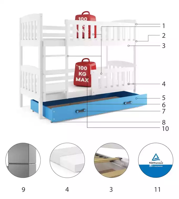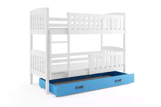 KUBUŚ jaunimo dviaukštė lova 90×190 su čiužiniu ir stalčiumi, balta/mėlyna