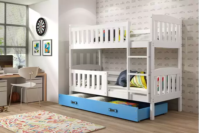 KUBUŚ jaunimo dviaukštė lova 90×190 su stalčiumi, balta/mėlyna