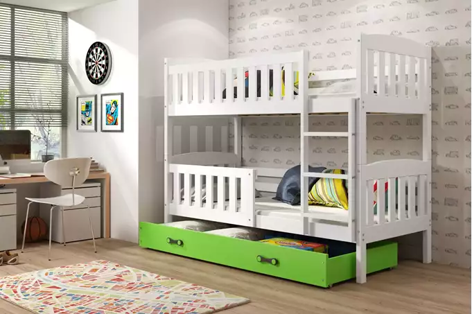 KUBUŚ jaunimo dviaukštė lova 90×190 su stalčiumi, balta/žalia