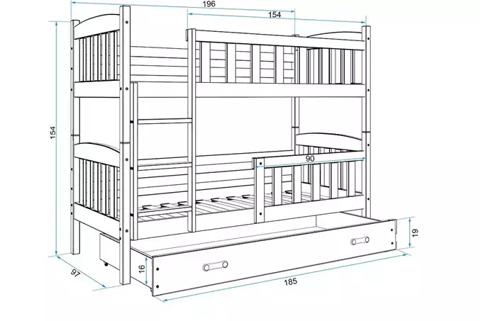 Būkite pirmas aprašęs “KUBUŚ jaunimo dviaukštė lova 90×190 su stalčiumi, grafito/balta”