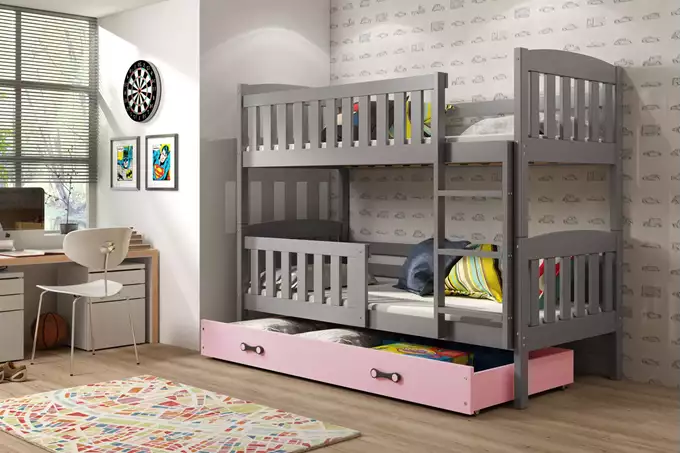 KUBUŚ jaunimo dviaukštė lova 90×190 su stalčiumi, grafito/rožinė