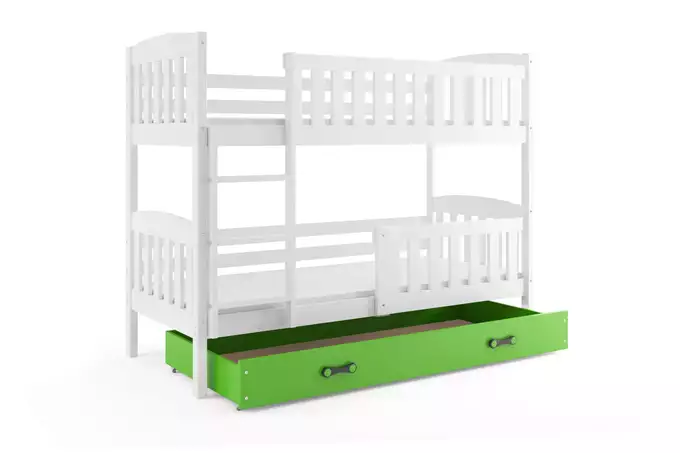 KUBUŚ jaunimo dviaukštė lova 90×200 su čiužiniu ir stalčiumi, balta/žalia