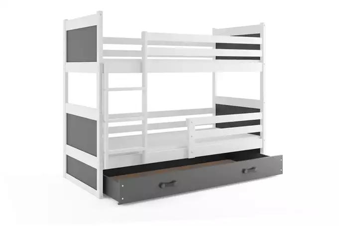 RICO 90×200 jaunimo dviaukštė lova su čiužiniu ir stalčiumi, balta/grafito spalvos