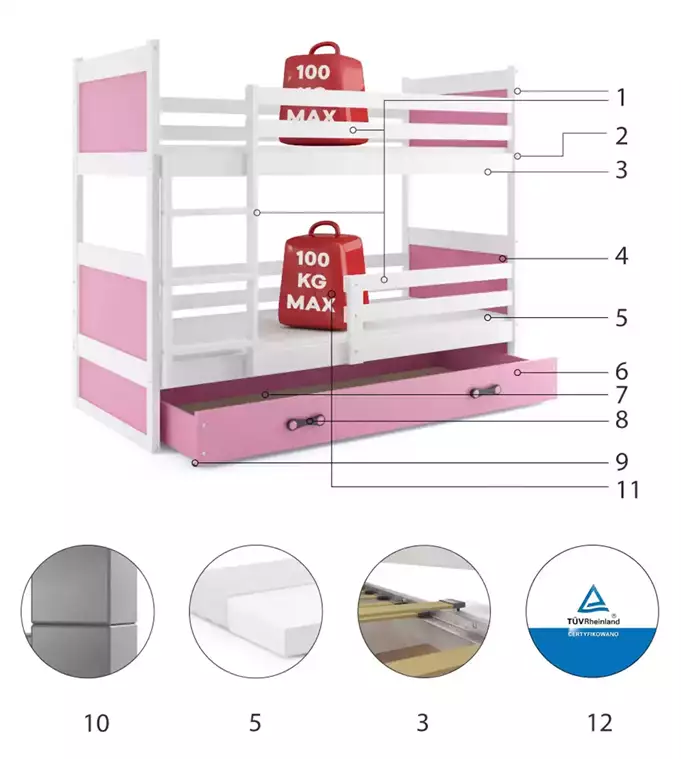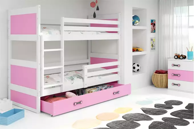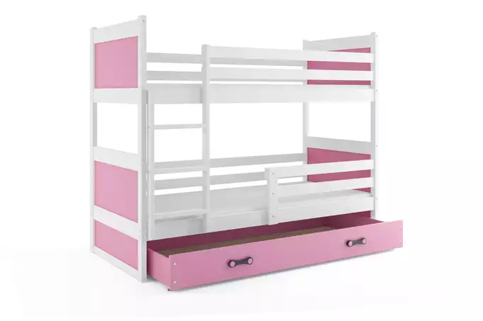 RICO jaunimo dviaukštė lova 90×200 su čiužiniu ir stalčiumi, balta/rožinė