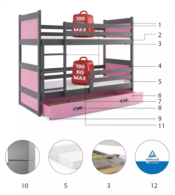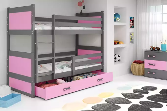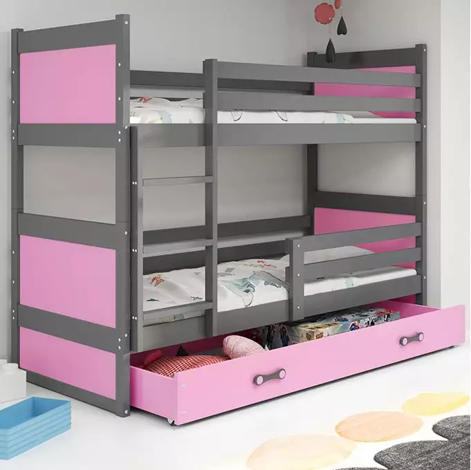 Būkite pirmas aprašęs “RICO 90X200 jaunimo dviaukštė lova su stalčiumi, grafito/rožinė”
