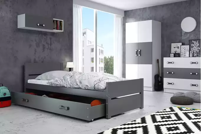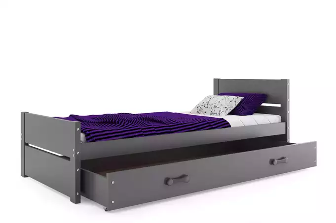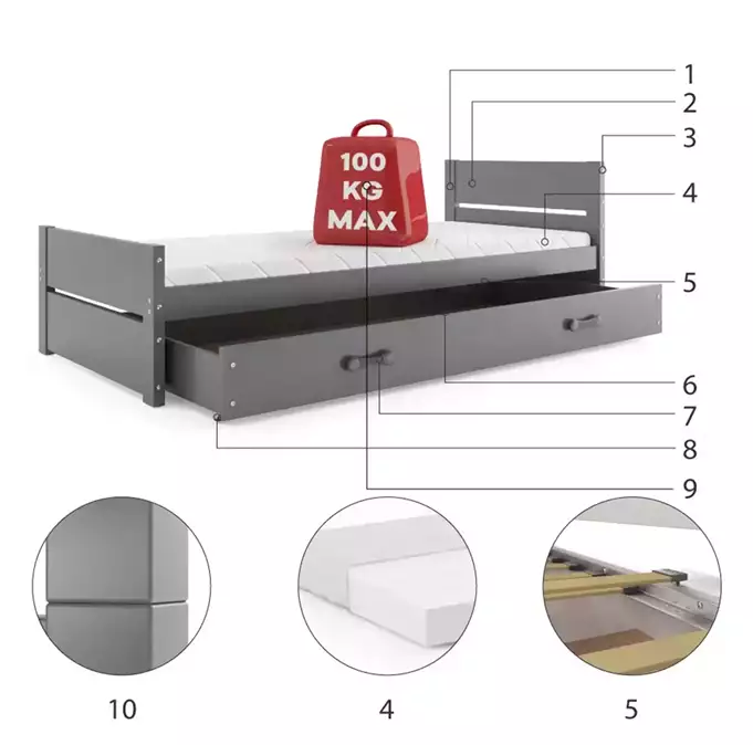 Lovos rėmas – pagamintas iš pušies medienos, dažytas vandens pagrindo laku. Medžio drožlių plokštė. Surinkimo priedai – greitas ir paprastas surinkimas. Čiužinys: nėra. Rėmas – esame vieninteliai, siūlantys rėmą iš spyruoklinių lentelių, pagamintą iš beržo medienos, pritvirtintą PVC rankena ant metalinės juostelės, su spragtelėjimo sistema (greitas surinkimas). HDF plokštė. Stalčiaus rankena – pagaminta iš PVC. Stalčiaus ratukai. Keliamoji galia – 100 kg. Apvalinimo spindulys – R2.