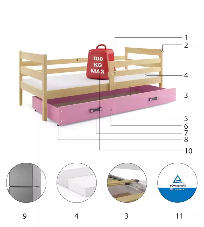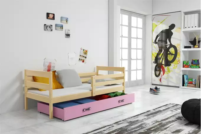 ERYK 90×200 viengulė jaunimo lova su čiužiniu ir stalčiumi, pušis/rožinė