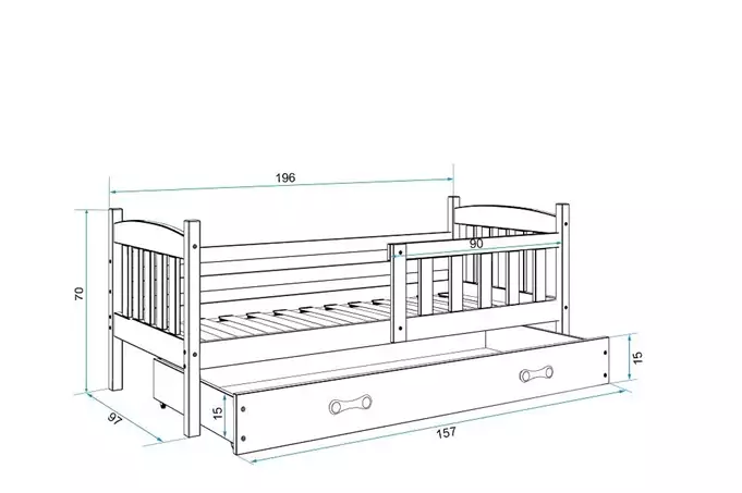 Lovos rėmas – pagamintas iš pušies medienos, dažytas vandens pagrindo laku. Surinkimo priedai – greitas ir paprastas surinkimas. Čiužinys – 7 cm storio, su nuimamu užvalkalu, oro kondicionavimo pluoštu ir poliuretano putomis. Užvalkalas – dygsniuotas hipoalerginis poliesterio audinys, su užtrauktuku. Rėmas – esame vienintelė įmonė, siūlanti rėmą iš spyruoklinių lentelių, pagaminto iš beržo medienos, tvirtinamo PVC rankena ant metalinės juostelės, naudojant spragtelėjimo sistemą (greitas surinkimas). HDF plokštė. Stalčius – pagamintas iš medžio drožlių plokštės. Stalčiaus rankena – pagaminta iš PVC. Stalčiaus ratukai. Apvalinimo spindulys – R2. Keliamoji galia – 100 kg. Sertifikuota lova – kokybė ir saugumas pagal TUV standartus.