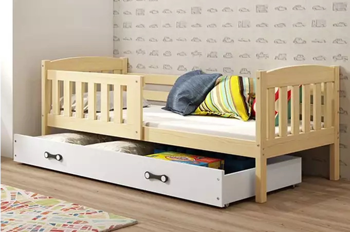 KUBUŚ viengulė jaunimo lova 90×190 su stalčiumi, pušis/balta