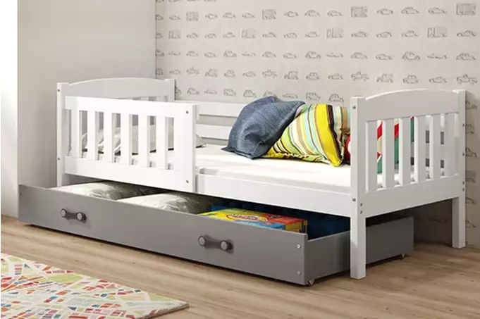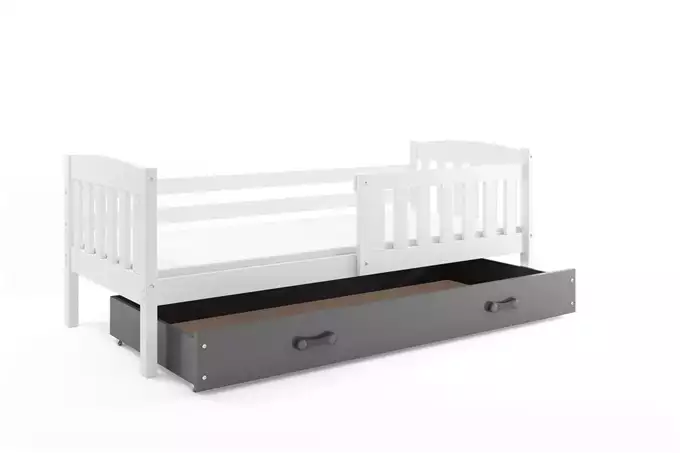 KUBUŚ viengulė jaunimo lova 90×200 su stalčiumi, balta/grafito spalvos