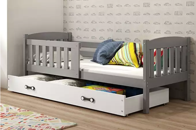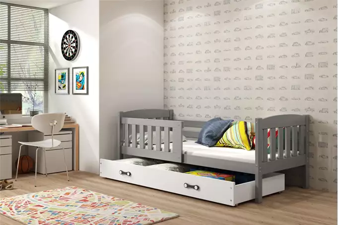 KUBUŚ viengulė jaunimo lova 90×200 su stalčiumi, grafito/balta