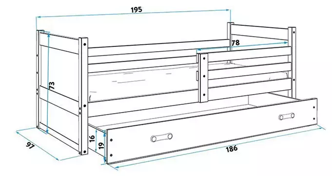 Lovos rėmas – pagamintas iš pušies medienos, dažytas vandens pagrindo laku. Surinkimo priedai – greitas ir paprastas surinkimas. MDF plokštė – dažyta vandens pagrindo laku. Čiužinys – 7 cm storio, su nuimamu užvalkalu, oro kondicionavimo pluoštu ir poliuretano putomis. Užvalkalas – dygsniuotas hipoalerginis poliesterio audinys, su užtrauktuku. Rėmas – esame vienintelė įmonė, siūlanti rėmą iš spyruoklinių lentelių, pagamintų iš beržo medienos, tvirtinamų PVC laikikliu ant metalinės juostelės ir spragtelėjimo sistema (greitas surinkimas). Maksimali apkrova – 100 kg. Išlinkis – R2 spindulys. Sertifikuota lova – kokybė ir saugumas pagal TUV standartus.